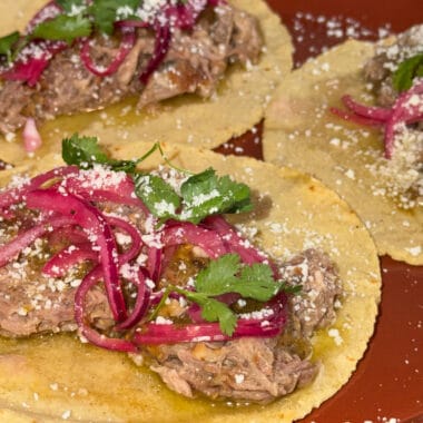 To serve, dip your corn tortillas in the rendered fat from the skillet and start building your tacos. Load them with the steak and caramelized onions, and top with salsa, fresh onion and cilantro, and a squeeze of lime. cilantro.